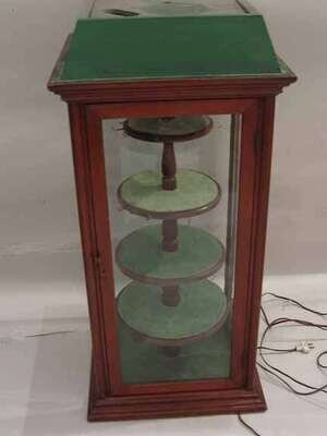 Of tall rectangular form, with a four shelf circular rotating display stand, encased by a glazed square case.