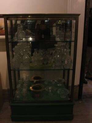 Glazed side panels, mirrored back, over a green plinth on wheels.