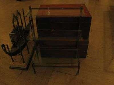 The rectangular based supports a long rectangular back that supports two adjustable bracket arms holding a graduating pair of glass shelves.