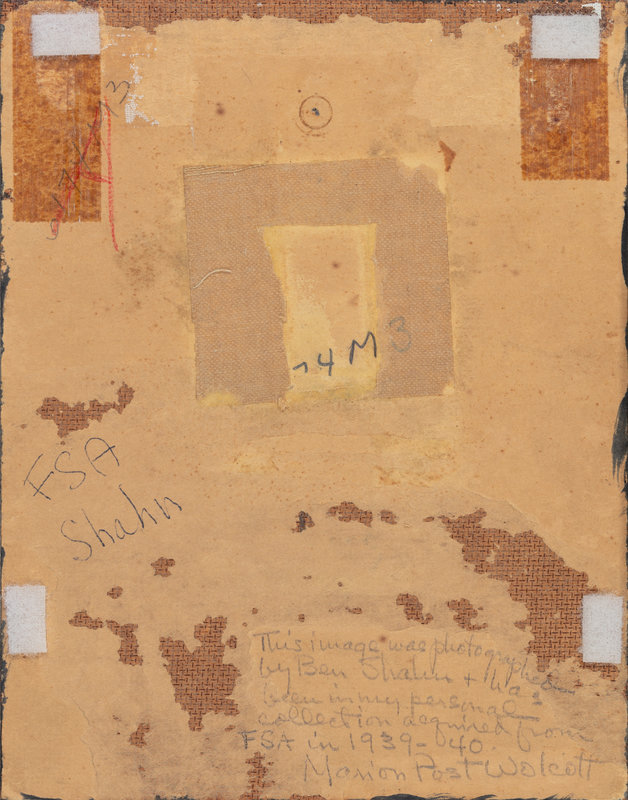 Gelatin silver exhibition print, flush-mounted on masonite and printed c. 1935, signed and inscribed 'this image was photographed by Ben Shahn and has been in my personal collection, acquired from the F.S.A. in 1939-40' by Marion Post Wolcott in pencil and 'Ben Shahn F.S.A.' credit in ink on the reverse of the flush-mount verso.