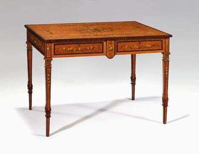 Painted throughout with trailing flowers, the crossbanded rectangular top centered by a musical trophy over a frieze drawer, raised on carved square tapered legs.