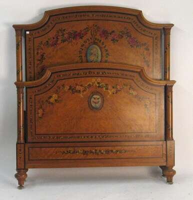The arched head and footboards flanked by two acanthus capped columns, painted with floral garlands and a central medallion.