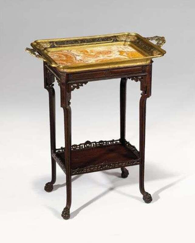 The inset onyx top with a flared gallery, decorated in relief with Chinoiserie panels, fret pierced spandrels and twin scroll handles, raised on reeded shaped legs united by a galleried undertier and terminating in claw and ball feet. NOTE: Edouard Lièvre (1829-1886) trained as a painter under Thomas Couture before turning his attention to industrial design. His earliest important work datable with certainty is the grand vase Persian designed for the Christofle firm in 1874 and exhibited at the Paris Expositions of 1878, 1889 and 1900. Among Lièvre's important clients were actress Sarah Bernhardt, courtesan Louise-Emilie Valtesse de la Bigne, and Albert Vieillard, director of Bordeaux's ceramics factory and an early Japonism enthusiast. The suite of furniture designed for Vieillard included the Cabinet Japonais now in the Musée d'Orsay, Paris. Following Lièvre's death, his designs were sold to George and Henri Pannier, owners of the elegant shop, l'Escalier de Cristal. The Pannier brothers produced altered versions of Lièvre's designs, including seven variants of Vieillard's Cabinet Japonais, one of which was sold to Grand Duke Vladimir of Russia and is now in the Hermitage, St. Petersburg.