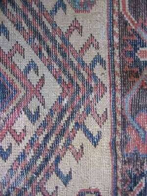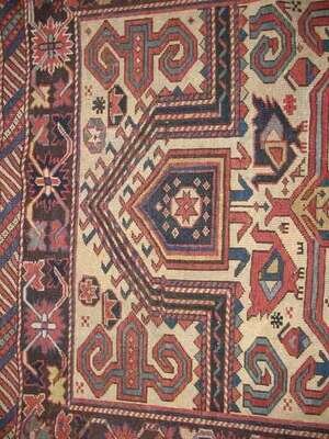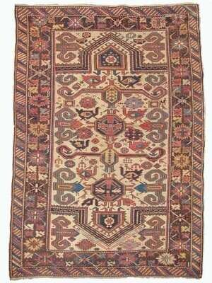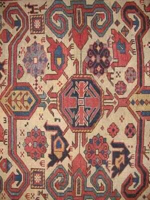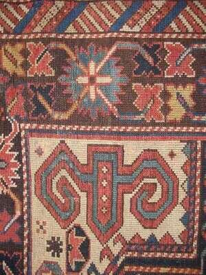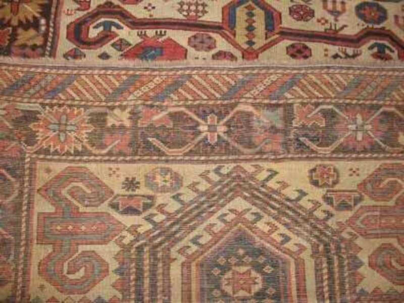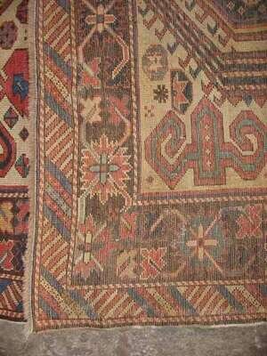 5 ft. 7 in. x 3 ft. 8 in. Perepedil note: There are two published examples of Perepedil double niche prayer rugs. One dates from the early 19th century, measures 7 ft. 7 in. x 3 ft. 6 in., and has cotton wefts and wool warps (Sotheby’s New York, sale of December 11, 1991, lot 11) and the other dates from circa 1870, measures 7 ft. 4 in. x 3 ft. 2 in., and has wool wefts and warps (Hali 58, p. 79). (Each is also published in Ralph Kaffel, Caucasian Prayer Rugs, London, 1998, plates 49 and 50, respectively, pp. 100-101 illustrated). The fields in those rugs contain seven shaped ‘ram’s horn’ motifs (also suggested to represent ‘calycinal blossoms’) (Kaffel, op.cit., p. 98, also citing Christine Klose, The Perepedil Enigma, Hali 55, February 1991, pp. 110-117) - three in the center of the field flanked by two pairs of horns/blossoms. Woven on cotton wefts and wool warps, the present rug is smaller and more squarish in size than the other two Perepedils. The borders in the present rug are nearly identical to the single niche Perepedil prayer rug in Eberhart Hermann, Seltene Orientteppiche VI, Munich, 1984, plate 39, pp. 108 illustrated (also featured on the cover of Hali op.cit.) The design of the present rug differs from the designs of the other two rugs because it contains two, rather than three horns/blossoms in the center of the field, and they are very elongated, nearly touching the major border. Additionally, the present rug contains an incomplete third pair of horns/blossoms, in addition to the two pairs of horns/blossoms in the field that flank the elongated horns/blossoms. Finally, the present rug, unlike the other two, has four additional horns/blossoms – one in each corner of the field, outside the mihrabs. .