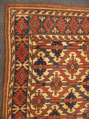 2 ft. 5 in. x 3 ft. 11 in. For similar examples of lattice design Yomud asmalyks with ashik borders, see Louise Mackie and John Thompson, Turkmen Tribal Carpets and Traditions, Washington, D.C., 1980, no. 75, p. 164, illustrated; Rugs of the Yomud Tribes, Christmas exhibition of the International Haji Baba Society, Inc., Washington, D.C., 1976, no. 37; and Ulrich Schurmann, Central Asian Rugs, Frankfurt, 1969, plate 33, page 109, illustrated.