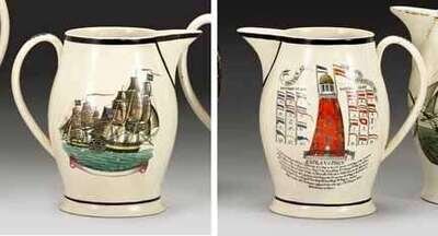 Rare transfer-printed and polychromed creamware pitcher probably herculaneum pottery, circa 1815