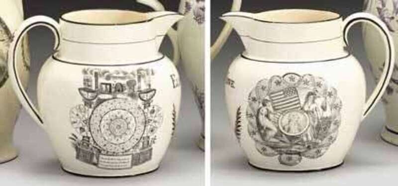 Decorated in black transfer with the bust of George Washington surrounded by figures and ribbon inscribed within a ribbon inscribed with the names of fifteen states; masonic decoration and verse, "The Light Shineth in darkness, and the darkness comprehendeth it not;" on reverse; "Elsa Howe," and berried branches in enamel below spout;.
