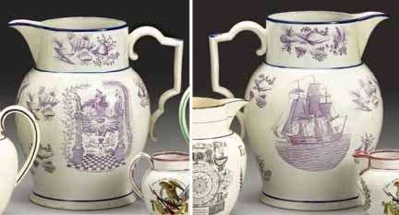 Decorated with "Jefferson Quotation" ( McCauley No. 155 ) under spout, one side with a three-masted ship, the other side with Masonic arms "United for the benefit of Mankind," enclosed by clusters of seashells and seaweed, heightened with blue banding and flourishes .