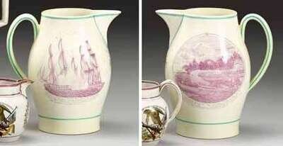 Decorated with the "L'Insurgant French Frigate of 44 guns & 411 men.."(McCauley No. 106), the reverse with the "Ship Building poem: Our Mountains are covered with imperial oak.."( McCauley No. 194), with the initials "J.S. M, " in black under spout and green striping.