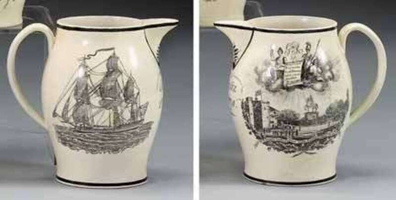 Decorated on one side with two allegorical figures flanking a scroll with verse "Happy would England be, could George but live to see, another Jubilee," below, the inscription, "Let the prisoners go free, give God praise, Jubilee, 25 Oct. 1809"; the reverse decorated with a three-masted ship, and "Daniel Pitton" below spout.