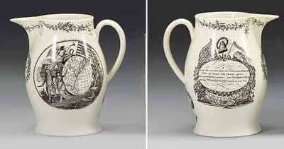 Decorated on one side with "Washington Map" (McCauley No. 58); the reverse decorated with "Independence" (McCauley No. 172), and verse "As he tills your rich glebe, the old peasant shall tell, While his bosom with Liberty glows, How your Warren expired - how Montgomery fell, and how WASHINGTON humbled your foes"; below spout "B.&E. Shaw," within wreath; below handle, a spread eagle.