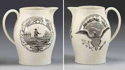 Of ovoid form decorated with "By Virtue and Valour, We Have Freed Our Country, Extended our Commerce and Laid the Foundation of a Great Empire" (McCauley No. 199), the other side decorated with "E Pluribus Unum" ( McCauley No. 157), with swag of grapes on the vine under the spout.