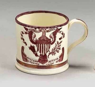 Pink lustre and magenta transfer-printed creamware mug early 19th century