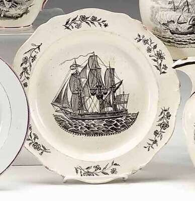 Shaped rim decorated with floral sprigs enclosing three-masted ship flying the American flag.