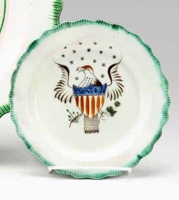 With scalloped green feathered edge enclosing eagle with shield and stars.