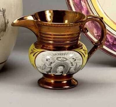 Of baluster form with canary mid-section having oval reserves enclosing "Cornwallis" on one side, "La Fayette," crowned in glory (McCauley No. 35) on the other, with group of fruit under the spout.