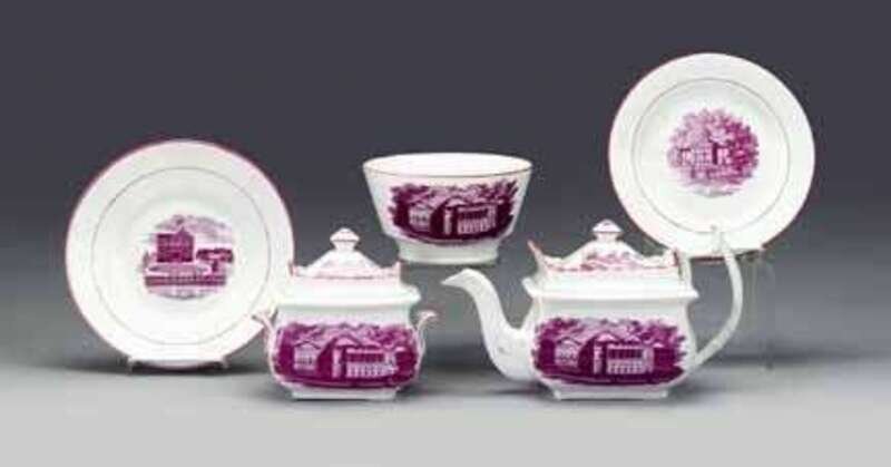 Including a teapot, covered sugar bowl and waste bowl decorated with the "Capital at Washington," a plate decorated with "Court House-Boston," and a shallow bowl decorated with "Scudder's American Museum."