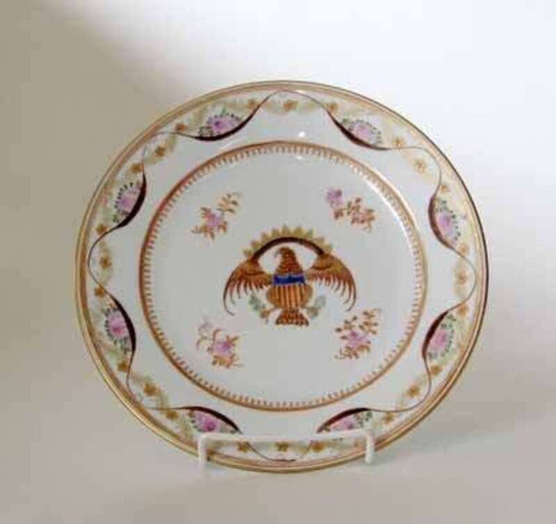 Polychrome decorated with central eagle and shield within a ribbon and floral border.