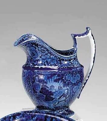 Historical blue transferware pitcher enoch wood and sons, burslem, 1819-1846