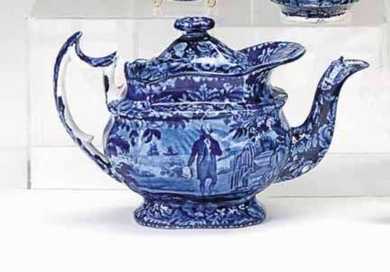 Historical blue transferware teapot enoch wood and sons, burslem, 1819-1846