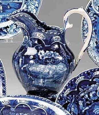 Historical blue transferware water pitcher james and ralph clews, cobridge, 1829-1836