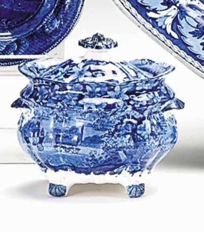 The oval lobed form with molded feet decorated with early locomotive on one side, and man with a plow wielding an axe on the other, within a floral border.