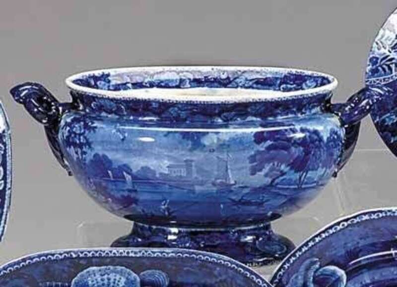 Historical blue transferware soup tureen enoch wood and sons, burslem, 1819-1836
