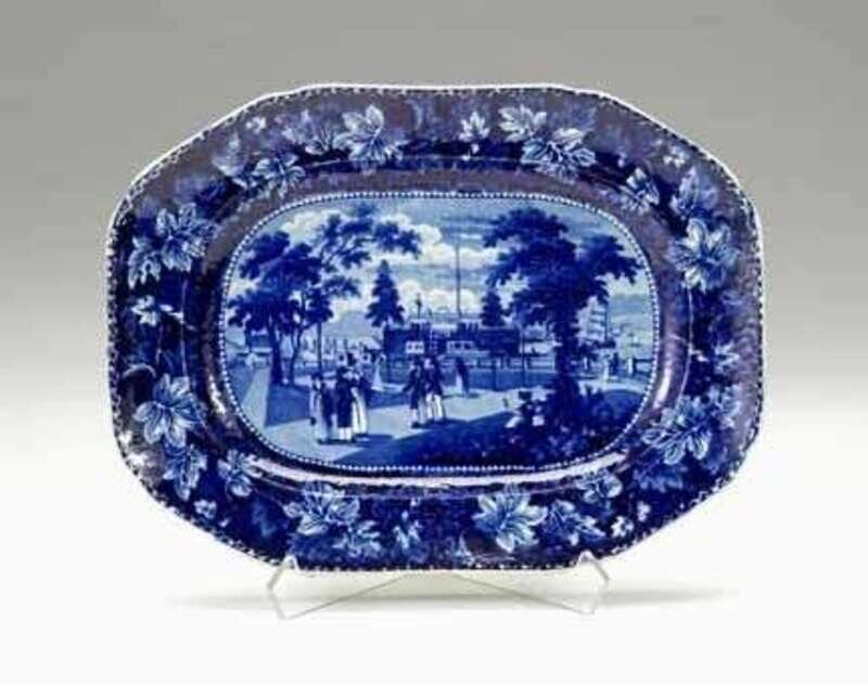 Decorated with "New York, Esplanade and Castle Garden" (Larsen No. 308), within a leaf and vine border, signed on ship's sail.