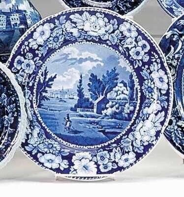 Historical blue transferware dinner plate andrew stevenson, cobridge, 1808-1829