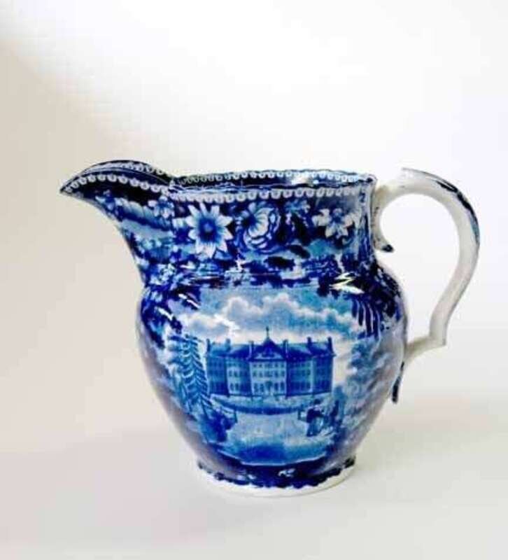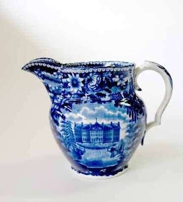 Historical blue transferware pitcher james and ralph clews, cobridge, 1829-1836