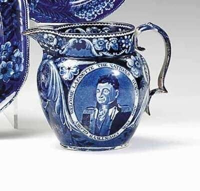 Historical blue transferware commemorative pitcher james and ralph clews, circa 1825