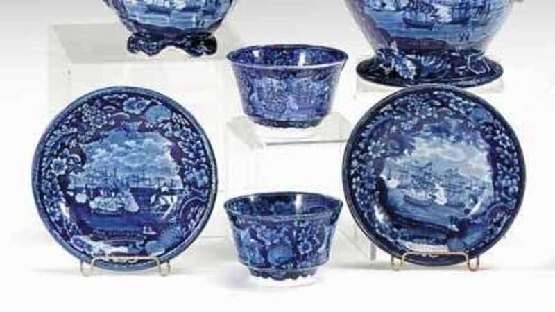 Two historical blue transferware teabowls and saucers enoch wood and sons, burslem, 1819-1846
