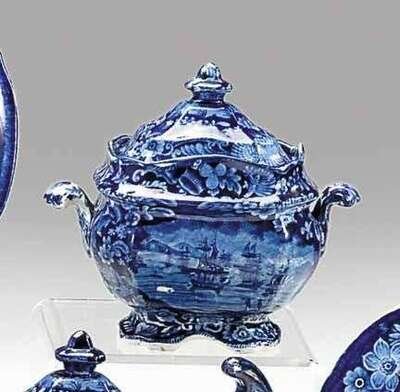 Historical blue transferware covered sugar bowl enoch wood and sons, burslem, 1819-1846