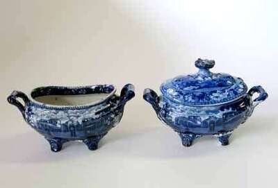 Decorated with "Fulton Market, New York" (Larsen No. 310), within vine borders, one tureen missing cover, one with impressed mark.