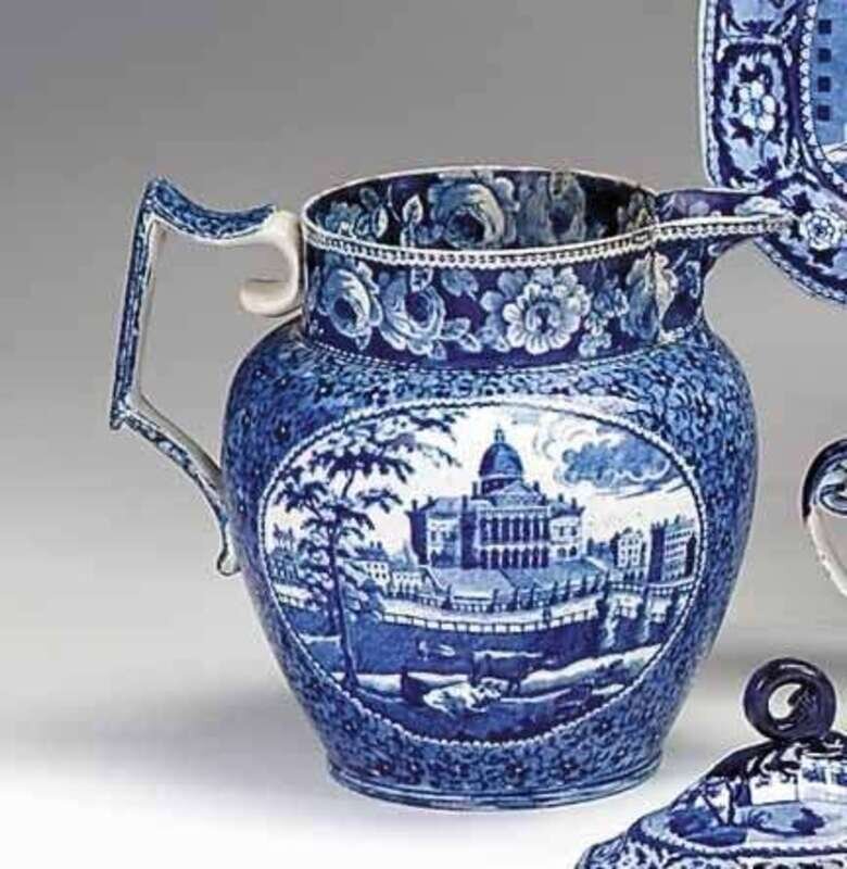 Historical blue transferware pitcher joseph stubbs, burslem, 1790-1829
