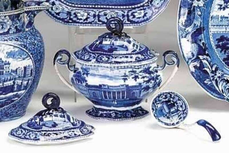 The sauce tureen with two "C" scroll handles, decorated on one side with "Bank, Savannah" (Larsen No. 185), the reverse with "Charleston Exchange" (Larsen No. 175), the cover with "Insane Hospital, Boston" (Larsen No. 170), and the ladle with "Charleston Exchange," together with an additional "Insane Hospital, Boston" cover.