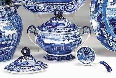 Historical blue transferware sauce tureen and ladle john & william ridgway, hanley, 1814-1830