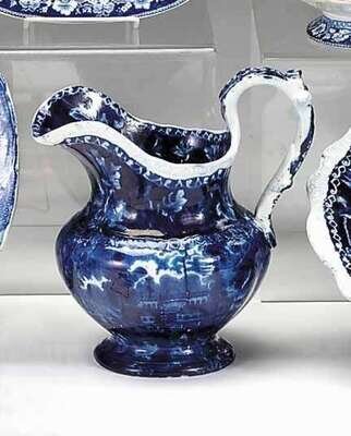 Of squat ovoid form with molded handle, decorated on one side with "Alms House, Boston" (Larsen No. 294), and with "Esplanade and Castle Garden, New York" (Larsen No. 308) reverse, within leaf and vine borders.