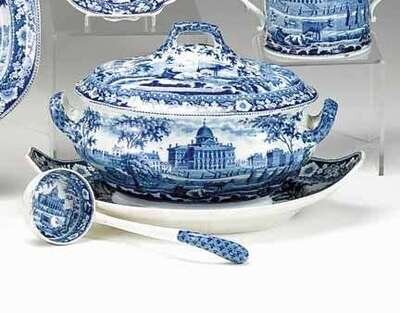 Historical blue transferware soup tureen, stand and ladle john rogers and son, longport, 1815-1842