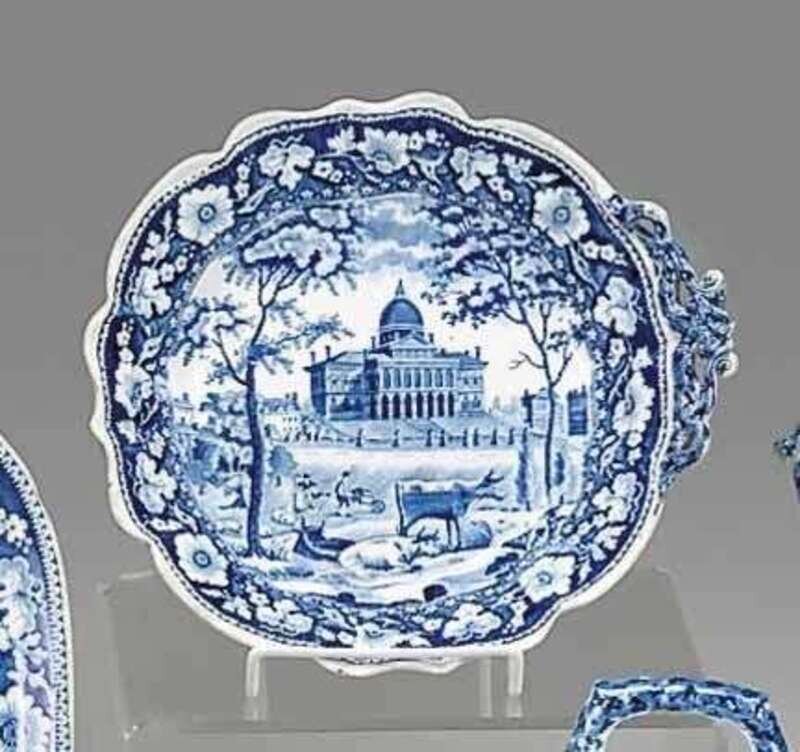 Having a scalloped edge and shaped handle, decorated with "Boston State House" (cows in foreground, two trees) within a flower and foliate border.