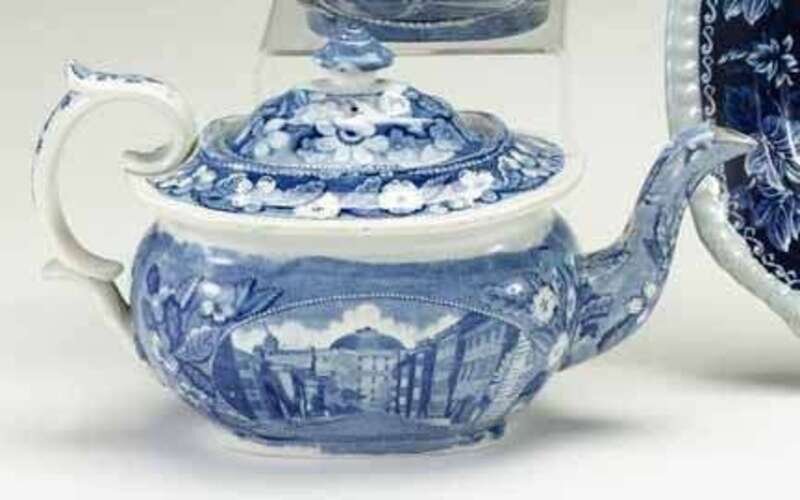 The oblong form with "c" scroll handle transfer-printed in medium blue with two Boston views, the "Indian Wharf and Broad Street Stores," and the reverse with the "Exchange House," within floral border.