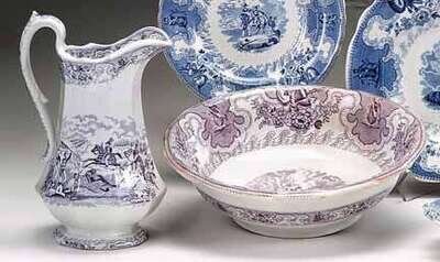Historical purple transferware pitcher anthony shaw, burslem, 1850-1878
