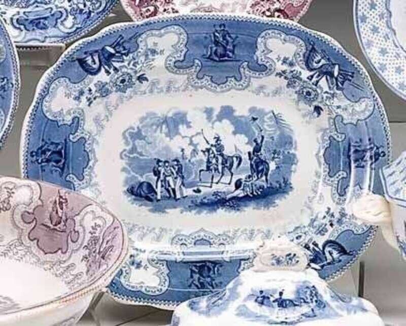 Historical medium blue transferware platter anthony shaw, burslem, 1850-1878
