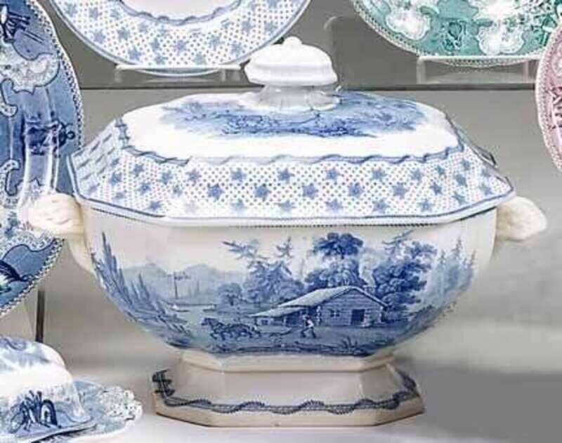 Historical medium blue transferware soup tureen and cover john ridgway, hanley, circa 1840