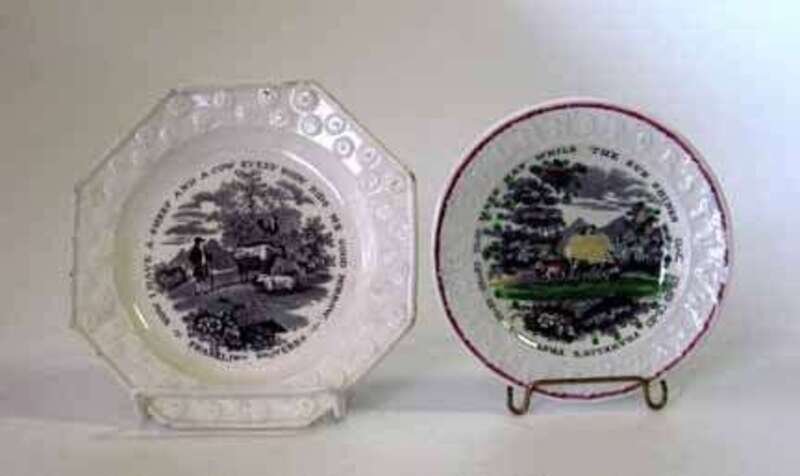 Both decorated with "Franklin's Proverbs" the first molded with alphabets and heightened with polychrome enamel inscribed "Make Hay While The Sun Shines," the second of octagonal form inscribed "Now I have a Sheep and a Cow Every Body Bids Me Good Morrow."