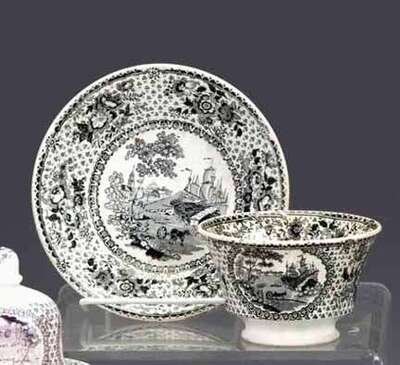 Historical black transferware teabowl and saucer ralph stevenson, 1810-1832