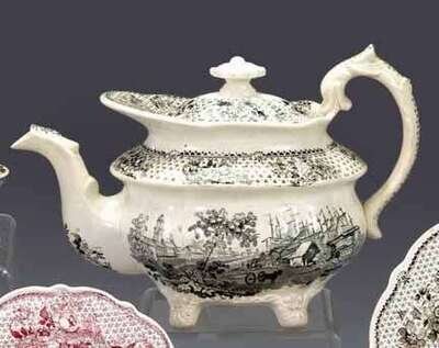 Historical black transferware teapot ralph stevenson, cobridge, 1815-1840