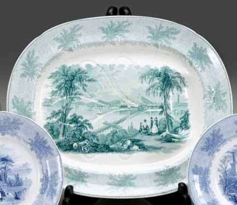 Historical green transferware well and tree platter william ridgway & son, circa 1844