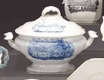 Oval lobed form with conforming cover and leaf molded handles and knop, the cover decorated with "Narrows of Staten Island," the base decorated with "Peekskill Landing Hudson River."