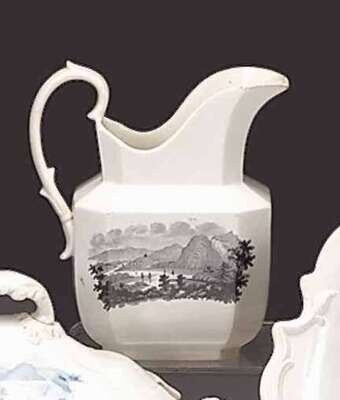 Historical black transferware pitcher william ridgway & co, bell bank works, hanley, 1830-1854